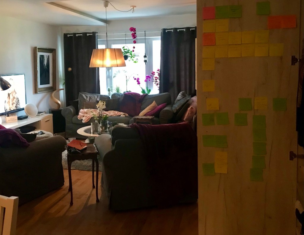Där på dörren planeras nästa skrivprojekt på det enda sätt som fungerar just nu. Idéer, enstaka ord och meningar på små lappar. Jag funderar under mina promenader, under stunder jag måste vila liggandes. Sedan skriver jag på de små lapparna. Skriver om, stryker, flyttar runt. Kanske blir det ordning och till slut, när jag mår bättre och hjärnan fungerar – en bok om smärta. Det är ett av mina sätt att överleva.