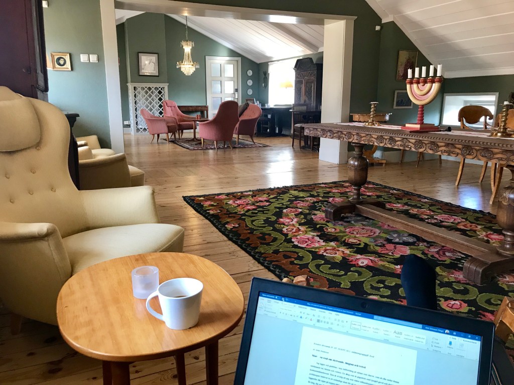 Både igår och idag har jag flyttat runt och provat olika skrivarplatser och åter kommit underfund med att det ÄR skillnad beroende på var jag sitter. Denna gång precis som senast jag var här är min bästa plats i en enkel fåtölj, nära ett fönster på plan fyra. Tomt och tyst, förutom ett lågt surrande från ventilationen. Älskar det här stället som andas lugn och stillhet.